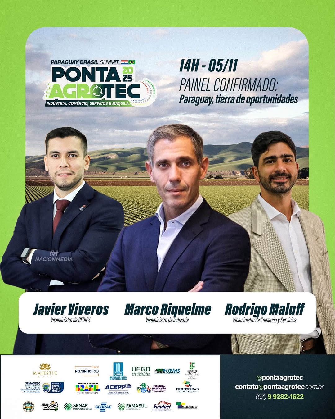 Os viceministros Javier Viveros, Marco Riquelme e Rodrigo Maluff,participam do painel “Paraguay, tierra de oportunidades” na Ponta Agrotec 2025.