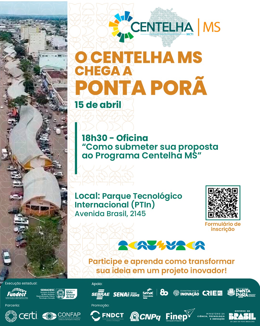 A Prefeitura de Ponta Porã promove, nesta quarta-feira, dia 15 de abril, às 18h30, uma oficina voltada a empreendedores interessados em participar do Programa Centelha. O encontro será realizado no Parque Tecnológico Internacional (PTIn), localizado na Avenida Brasil, região central da cidade.